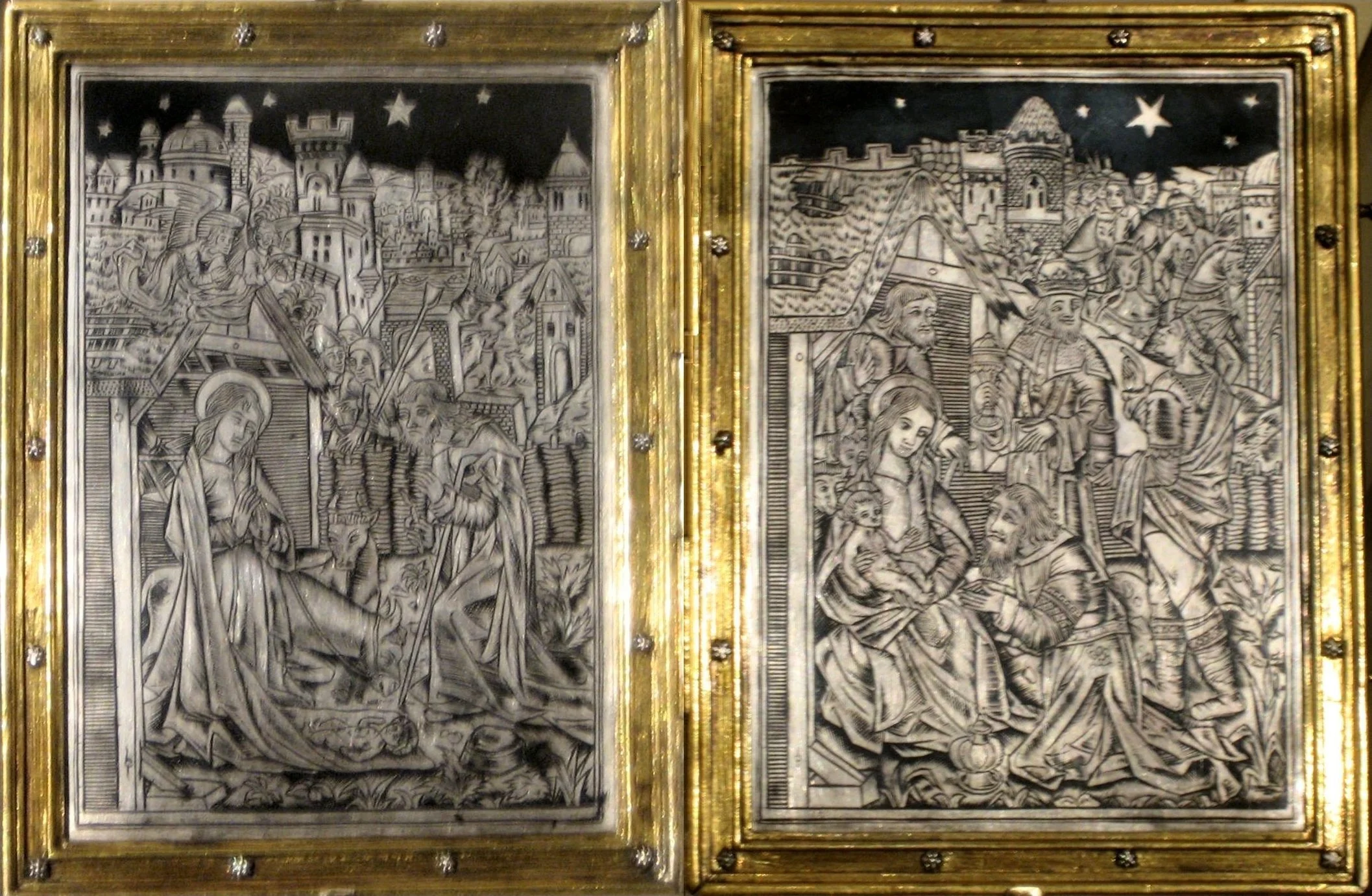 Diptych with nativity and adoration, silver and niello, engraved and guilded (gilded), copper alloy frame, Paris, c1500, The Cloisters, By wmpearl (The Cloisters, New York City) [Public domain], via Wikimedia Commons.